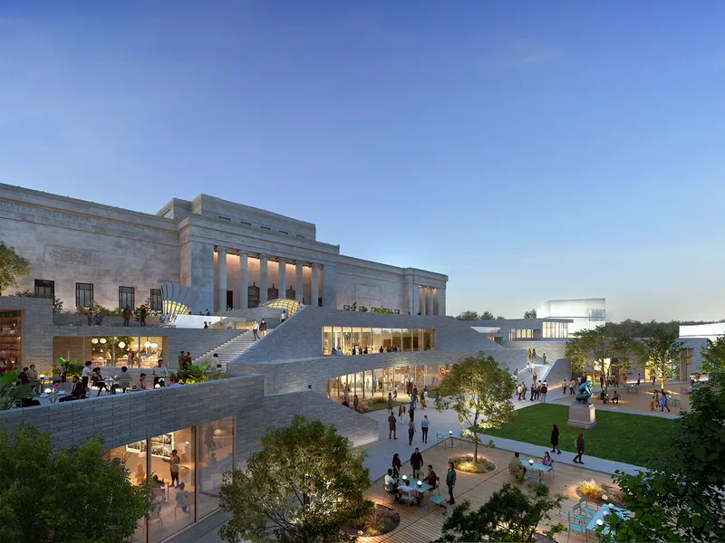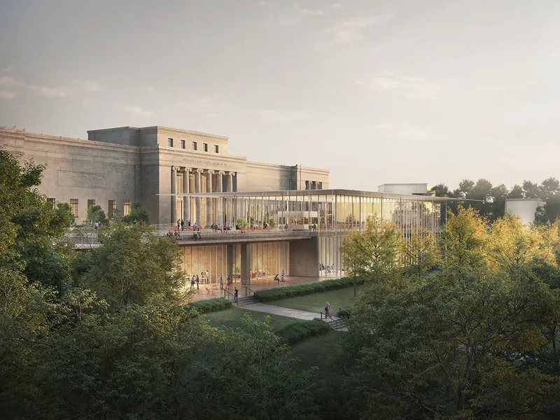 Percorsi fluidi uniscono il Nelson-Atkins Building del 1933, il Bloch Building e una nuova espansione fondata su materiali locali e gesti a misura d'uomo. Portici, passaggi coperti e terrazze dissolvono la forma, incoraggiando incontri spontanei e collegando il museo ai quartieri circostanti.