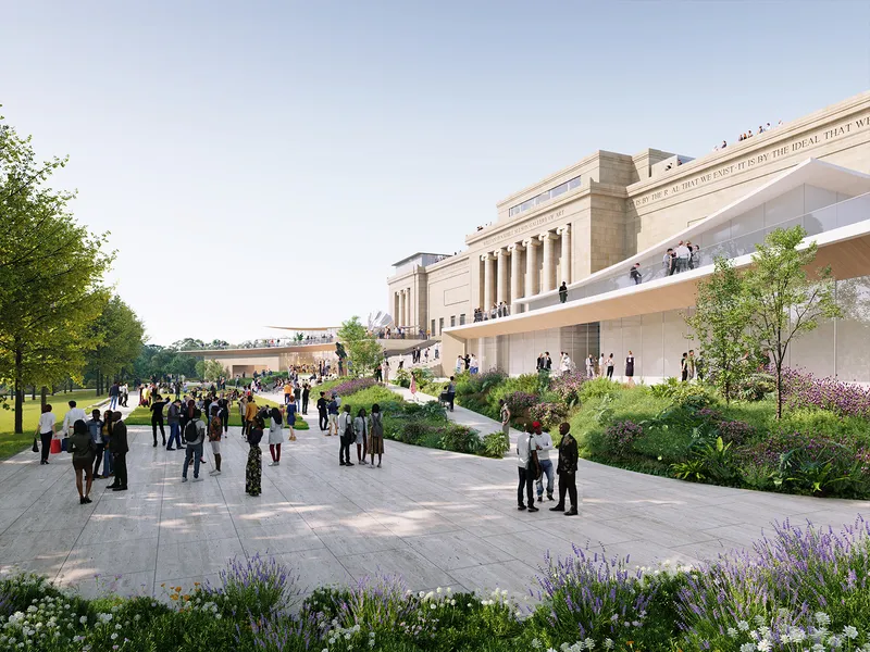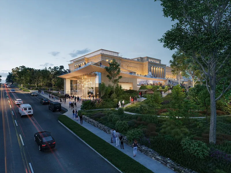 Concepita come "un abbraccio", la proposta avvolge i tre lati del museo esistente, creando nuove connessioni tra galleria, paesaggi e città. Il volume del nuovo padiglione d'ingresso accoglie i visitatori, mentre un nuovo sistema di percorsi collega spazi per l'arte, eventi, ristorazione e giardini. Fiore all'occhiello, la nuova Sky Wing, pensata per offrire una vista prospettica privilegiata su Kansas City.