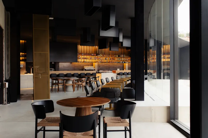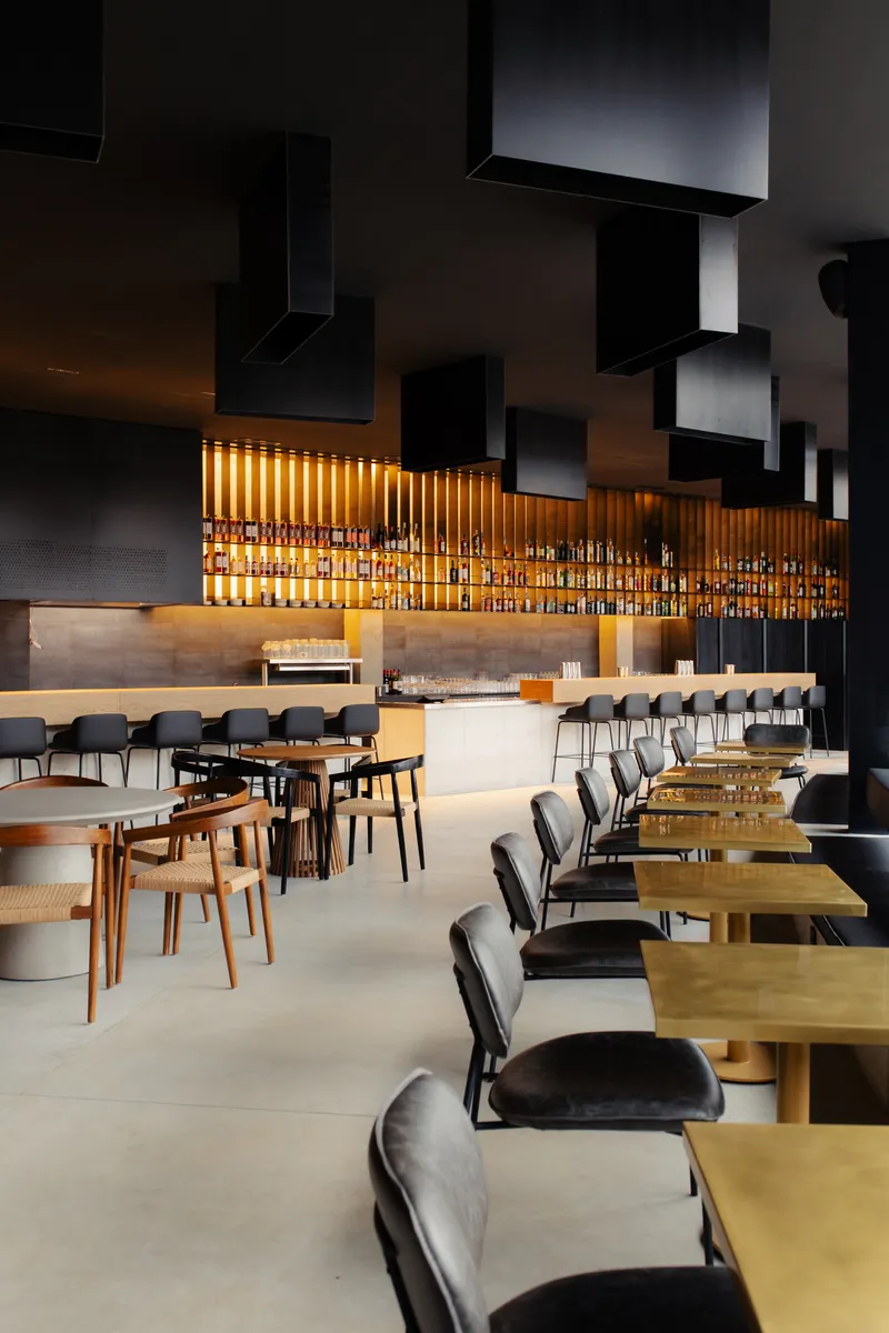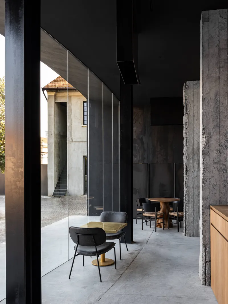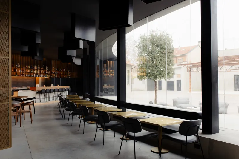 All'esterno, una panca segna la connessione visiva e materiale tra la piazza e gli interni del ristorante, interrotta da una parete vetrata. Il protagonista delle scelte architettoniche è il cemento, utilizzato sia per la pavimentazione che per il lungo banco da cucina, il banco del cocktail bar e la postazione de dj.