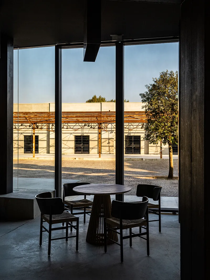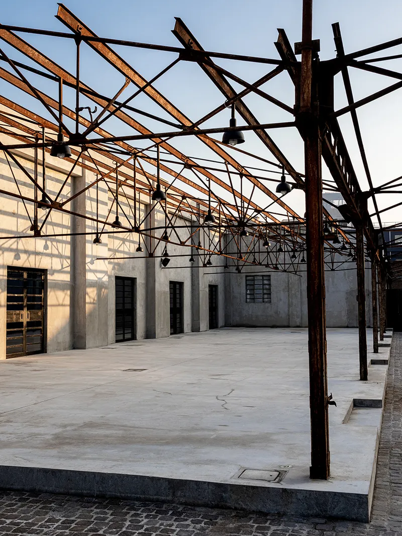 Il passato industriale e l'autenticità del luogo emergono candidamente nelle pareti lasciate volutamente allo stato grezzo, enfatizzati dalla sovrapposizione di elementi contemporanei in ferro ossidato, come la grande pergola che domina la piazza.