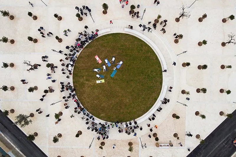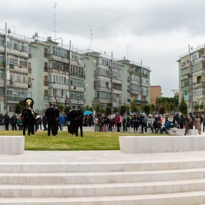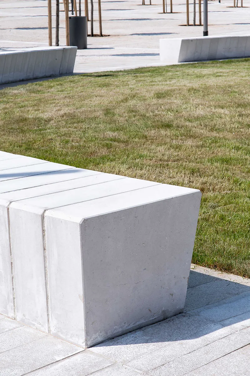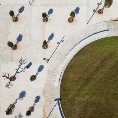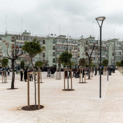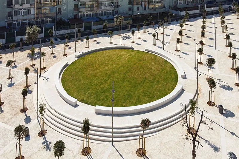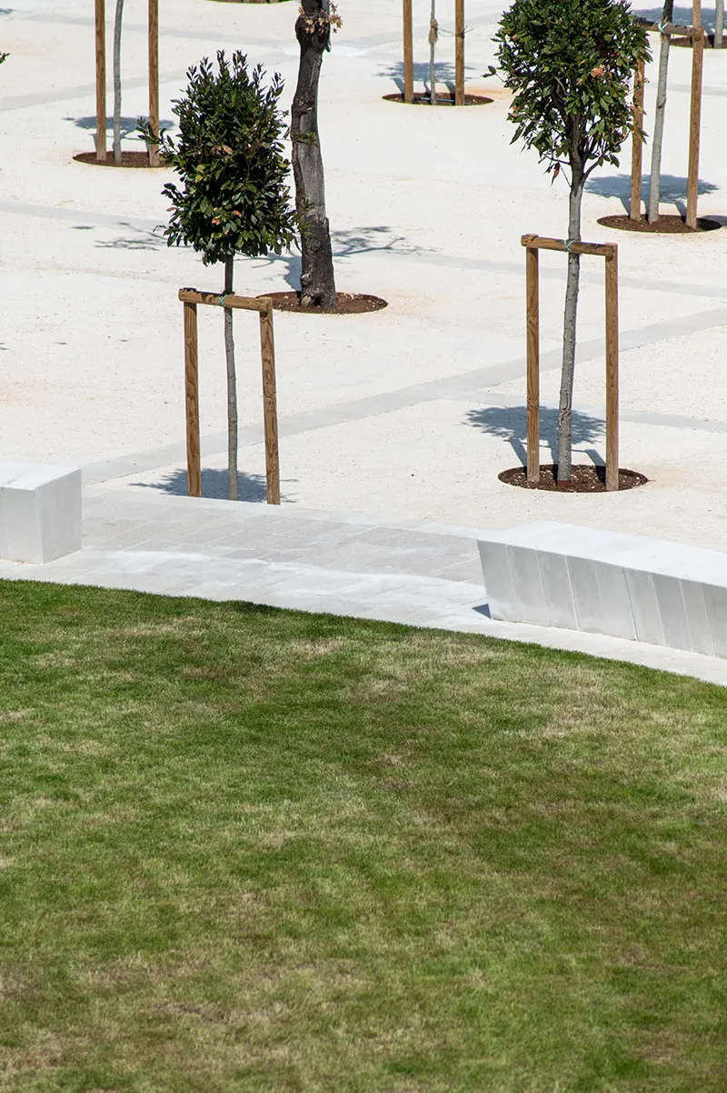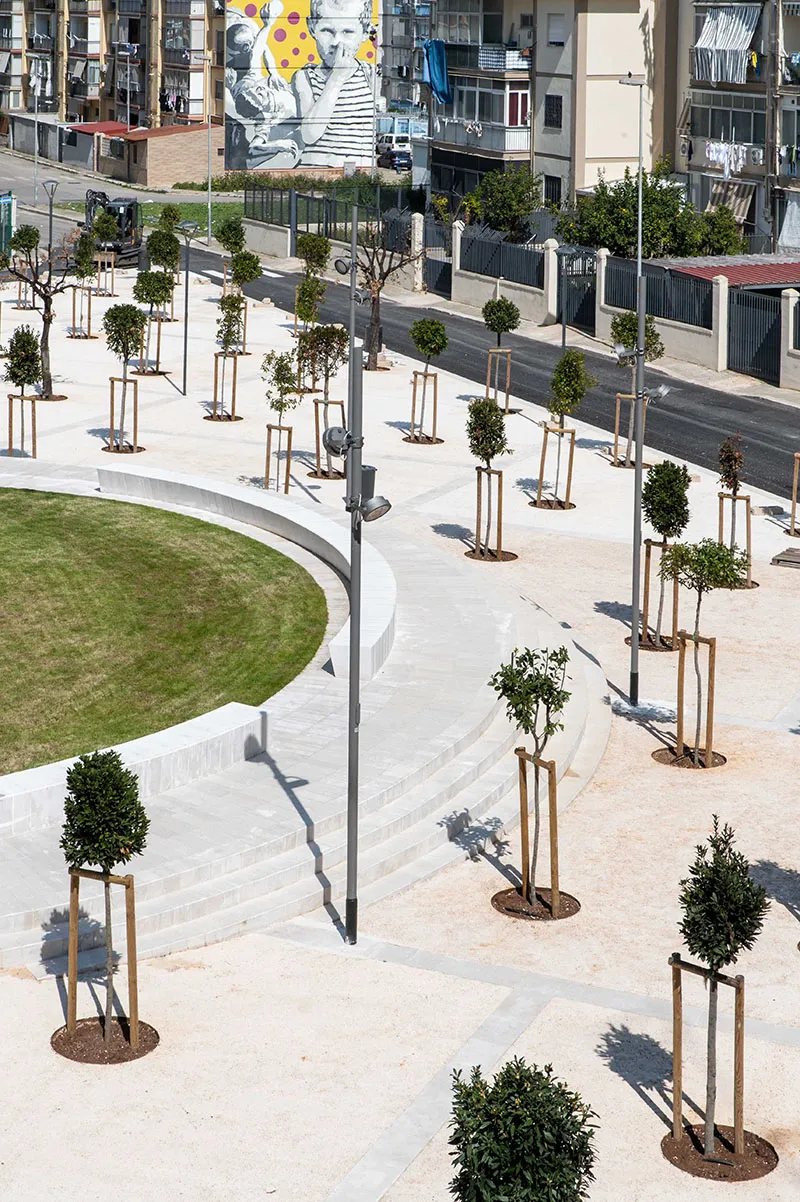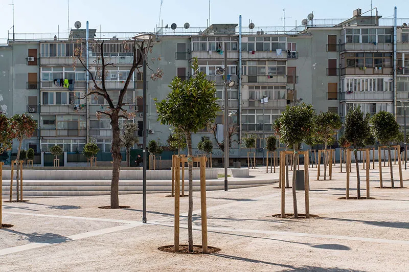 Uno spazio di risulta, di forma triangolare, per niente frequentato dagli abitanti, circoscritto da tre edifici in linea che lo chiudono su tre lati è stato trasformato in un luogo di relazione. Non appena i 127 alberi (allori e lecci) cresceranno, a conformare la nuova piazza vi sarà un "tetto verde" composto dalle chiome, interrotto nel centro da un foro circolare, cui corrisponde, al suolo, una radura, ossia un prato circondato da sedute disposte in circolo. Al tema arboreo si affianca quello della permeabilizzazione e rimodellazione del suolo. Via le betonelle, per far posto alla terra stabilizzata drenante e ad un sistema di cordoli in pietra locale.