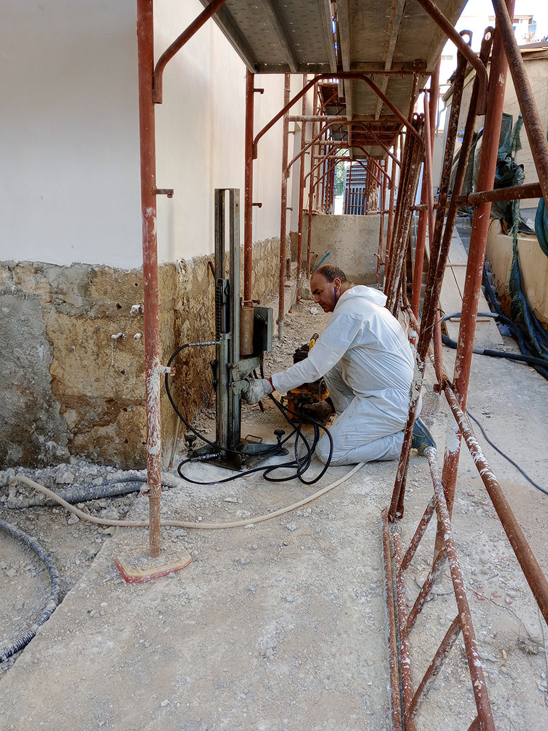 L’intervento è stato realizzato in quattro giorni e ha consentito il trattamento di circa 50 metri lineari di fondazione continua. Tutte le operazioni di consolidamento sono state realizzate attraverso l’esecuzione di micro-perforazioni, senza necessità eseguire scavi o demolizioni delle pavimentazioni.