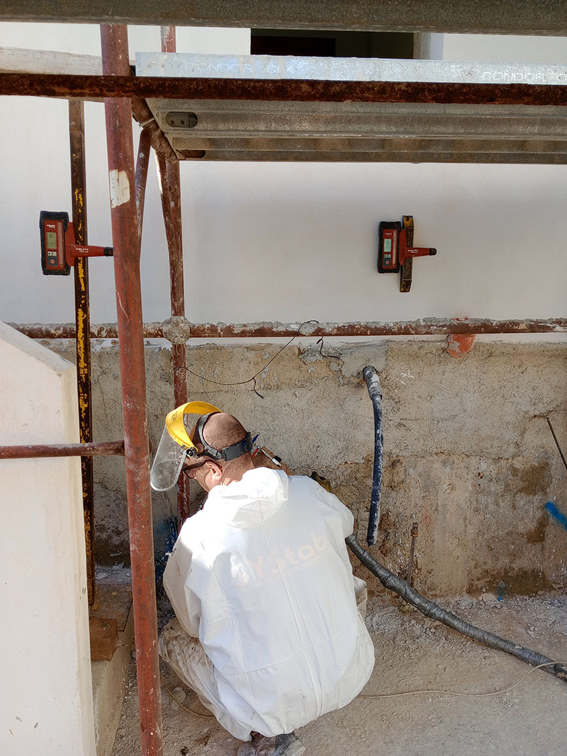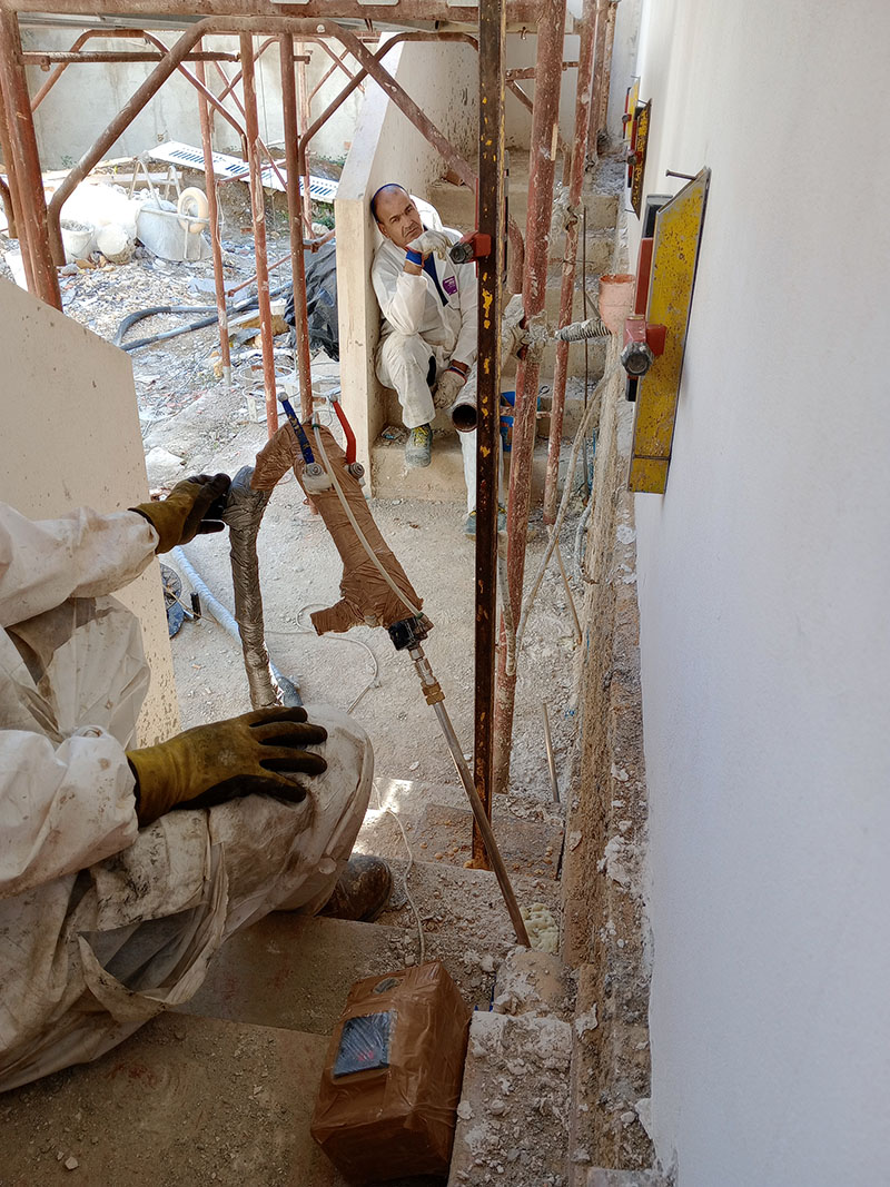 Le iniezioni di resine a lenta espansione vengono eseguite attraverso piccole perforazioni di diametro pari a 25 mm che attraversano tutta la fondazione fino al terreno da consolidare. Vengono poi inserite nei fori cannule di alluminio attraverso le quali verrà inoculato il sistema bicomponente autoespandente.