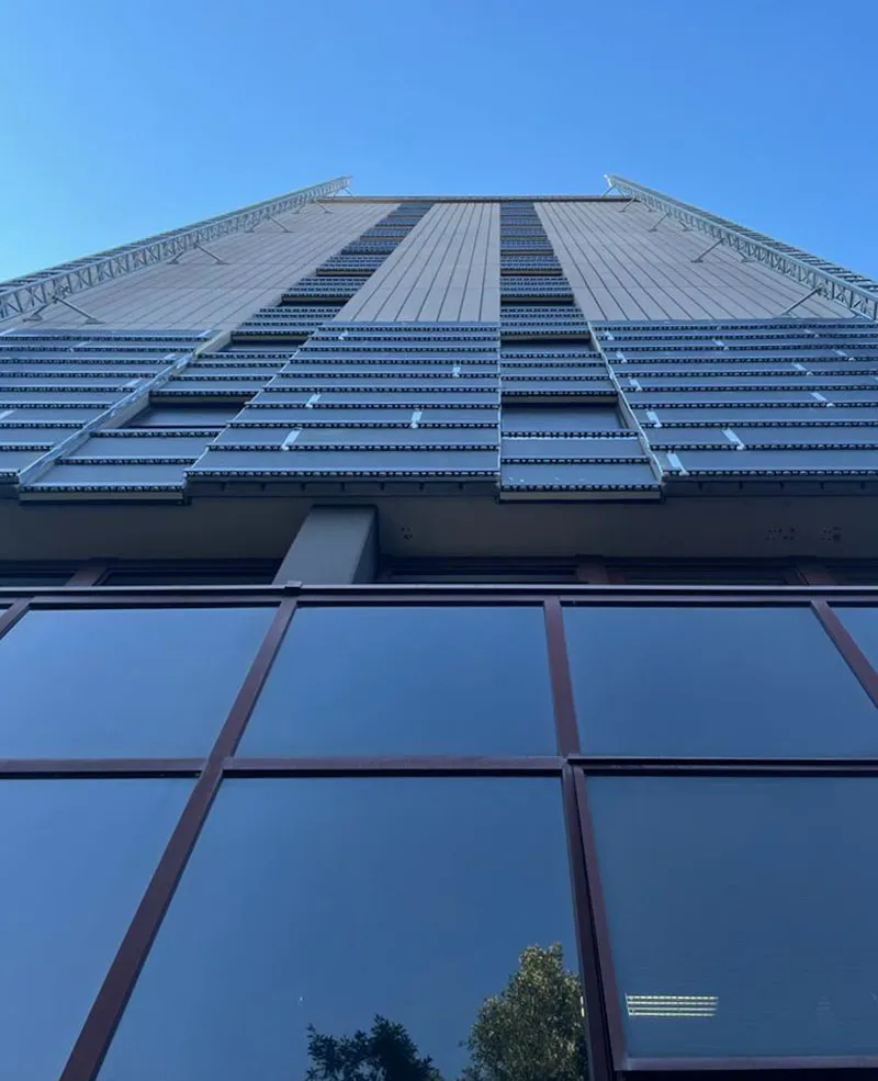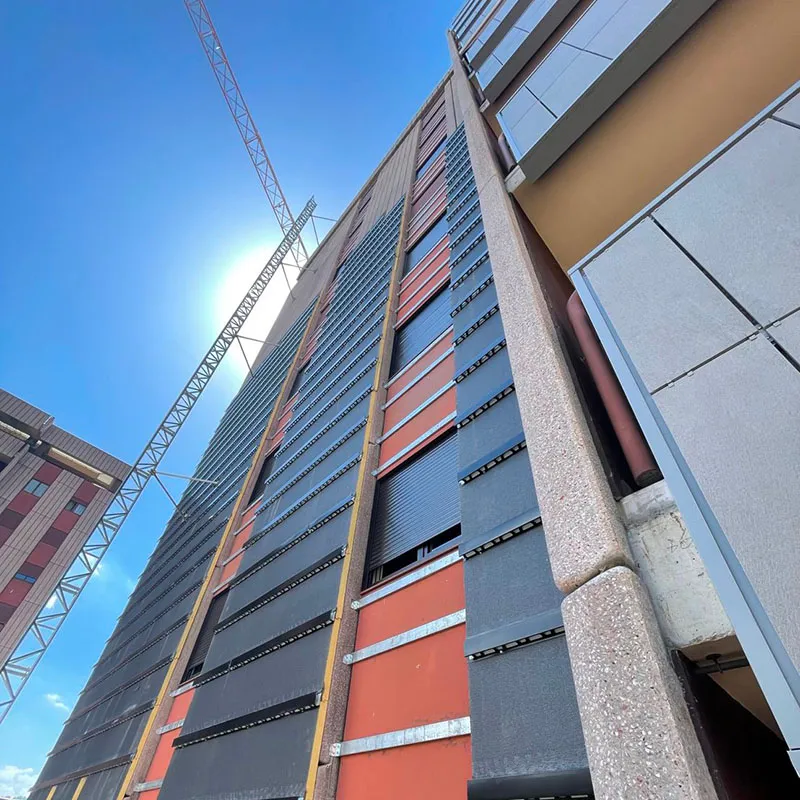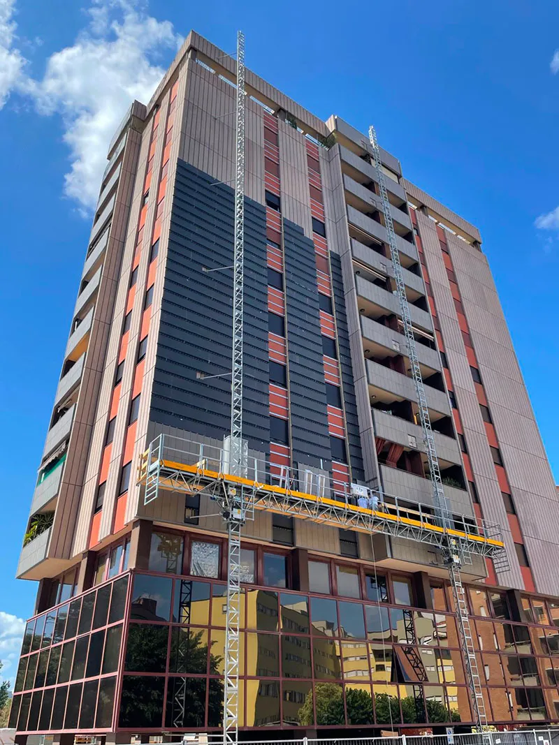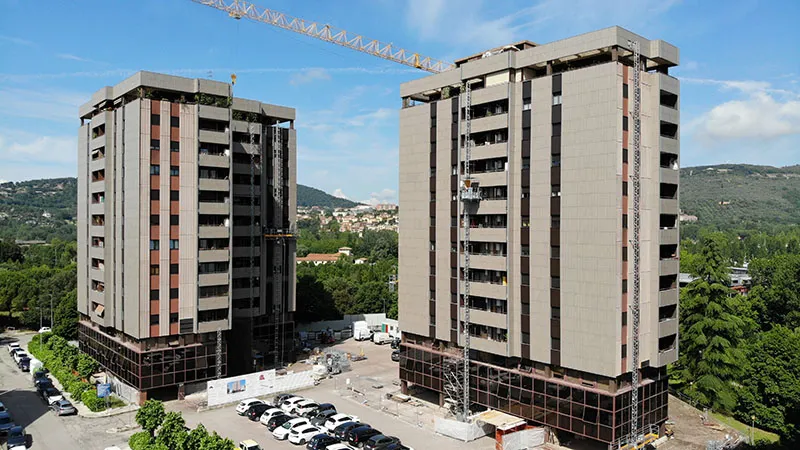 La scelta del sistema isolante è ricaduta sul sistema Isotec di Brianza Plastica e, in ragione dell’altezza di 12 piani dei due palazzi, gli ingegneri Marco Balducci e Roberto Regni di Area Progetto Associati hanno optato, in particolare, per il sistema Isotec Parete Black, con anima isolante in poliuretano espanso rigido (PIR) autoestinguente e rivestimento in estradosso in coating minerale ignifugo. Il pannello, dal caratteristico colore antracite, si caratterizza per le migliorate prestazioni di reazione al fuoco (classe B-s2, d0).