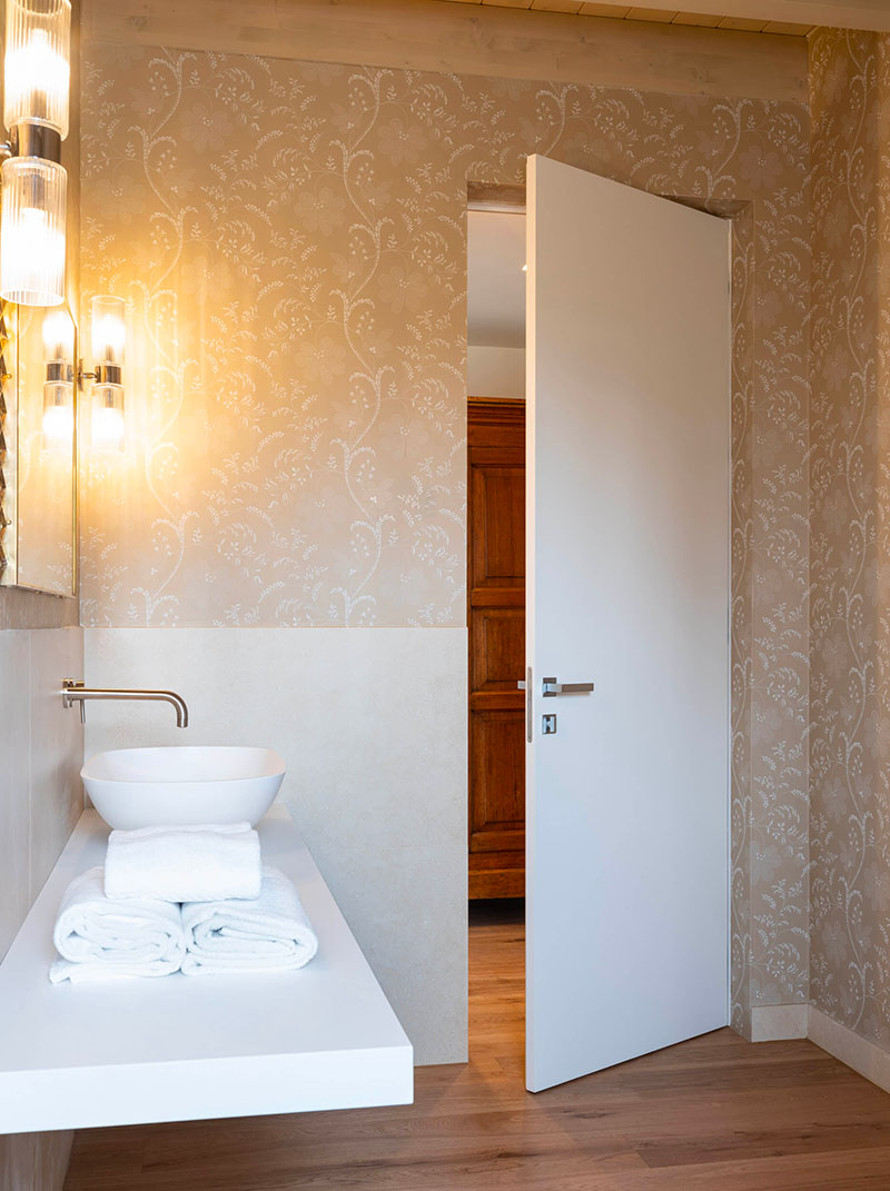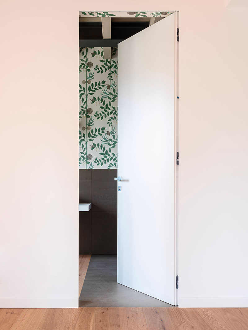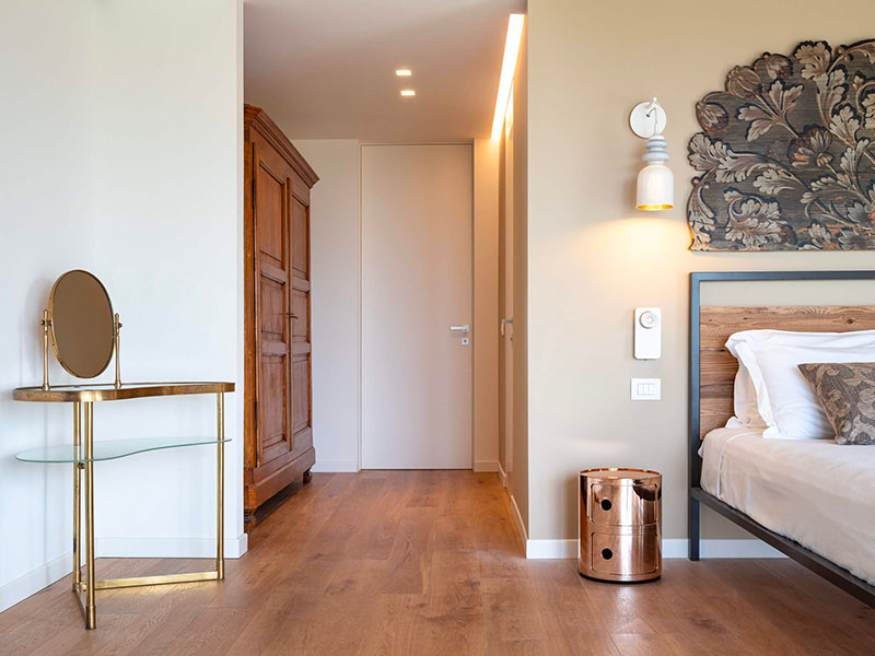 Per garantire la privacy in ogni abitazione, le separazioni sono affidate alle porte a battente filomuro Eclisse Syntesis Line Battente sia nell’accesso alle camere e per bagni privati.