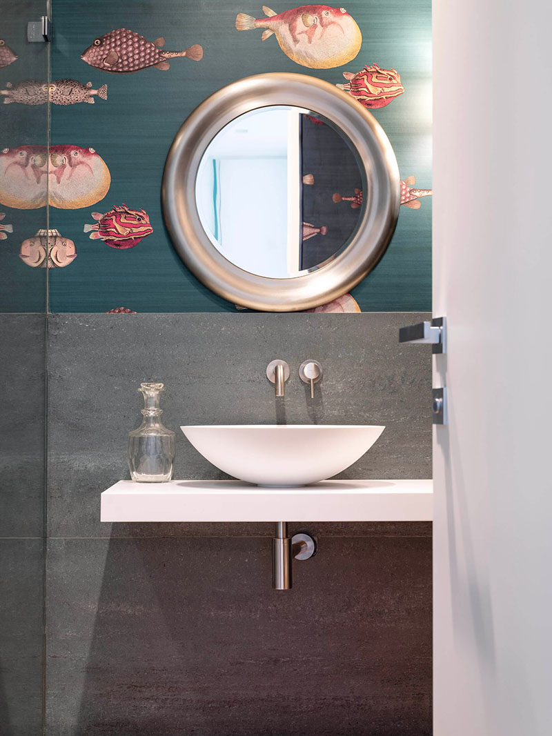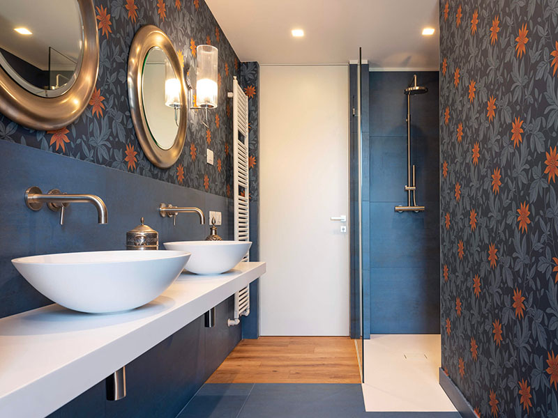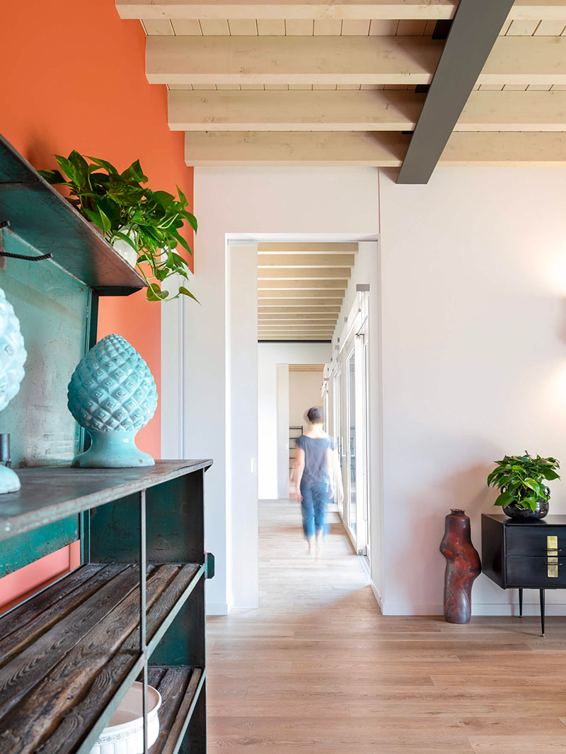 Se al piano terra, infatti, dominano colori caldi e accesi che restituiscono ambienti vivaci e conviviali, al primo piano che ospita la zona notte, più intima e privata, prevalgono toni freddi e più sobri che vanno dall’azzurro al blu profondo, dal verde al marrone e al beige.