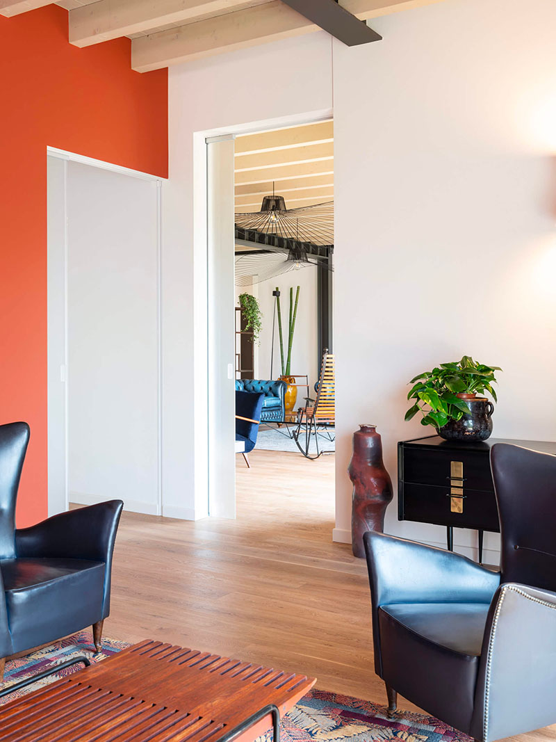 La scelta delle soluzioni Eclisse scorrevoli a scomparsa e a battente filomuro secondo lo spazio e le sue esigenze ha permesso di creare luoghi flessibili per l’uso ricettivo, sia per i gruppi di amici che per le famiglie.
