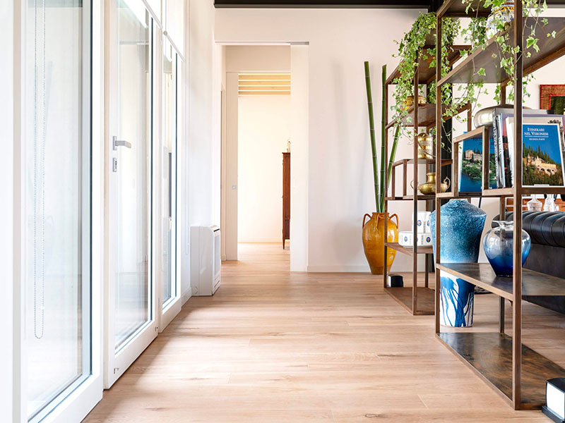 La distribuzione si avvale delle porte a scomparsa filomuro Eclisse Syntesis Line, prive di stipiti, che hanno permesso di creare suggestive prospettive fra gli ambienti e con gli spazi esterni.