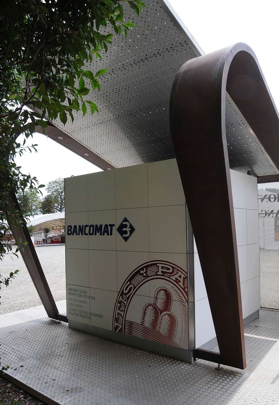 La "pelle esterna" rivestita con piastrelle di grès porcellanato Fiandre ACTIVE ha una superficie di circa 25 mq., la loro azione nei confronti dell'ambiente, come risulta da specifiche ricerche, equivale a quella di un albero di medio fusto. Pertanto possiamo affermare che "l'installazione di un bancomat solare, grazie ad ACTIVE di Fiandre, equivale a piantare un albero nell'ambiente dove viviamo". Dott. Arch. Franco Biondi