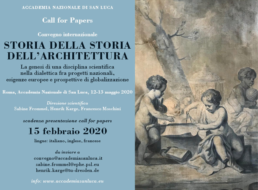 L'Accademia Nazionale di San Luca bandisce una call for papers per selezionare i contributi del convegno internazionale "Storia della storia dell'architettura. La genesi di una disciplina scientifica nella dialettica fra progetti nazionali, esigenze europee e prospettive di globalizzazione", che si terrà il 12 e il 13 maggio 2020 a Roma.