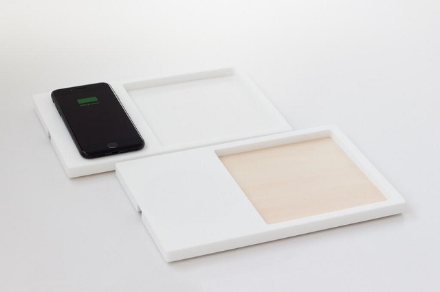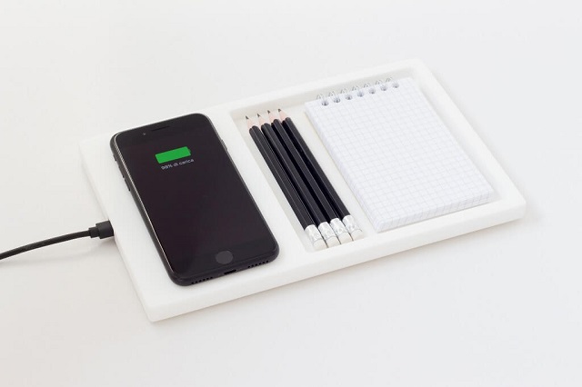 Un oggetto caratterizzato da una doppia innovazione che unisce l’utilizzo di un materiale versatile e resistente come il solid surface, con l’alta tecnologia grazie all’inserimento di un congegno di carica wireless QI collegato alla rete elettrica che riduce l’impatto della parte tecnica a favore del design e della forma. E’ sufficiente appoggiare lo smartphone sul vassoio e la ricarica inizia all’istante, mentre la presenza dello spazio laterale è pensato per poter contenere piccoli oggetti.