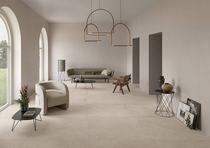 Nell’immagine, sofisticato living realizzato con la nuova collezione Geo, di Ceramiche Keope, finitura Ivory, formato 120×120 cm.