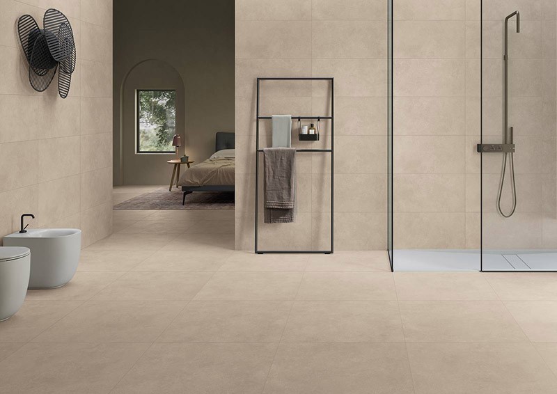 Nell’immagine, raffinato ambiente bagno realizzato con la nuova collezione Geo, di Ceramiche Keope, finitura Beige. A pavimento il formato 80×80 e a parete il 40×80 cm.