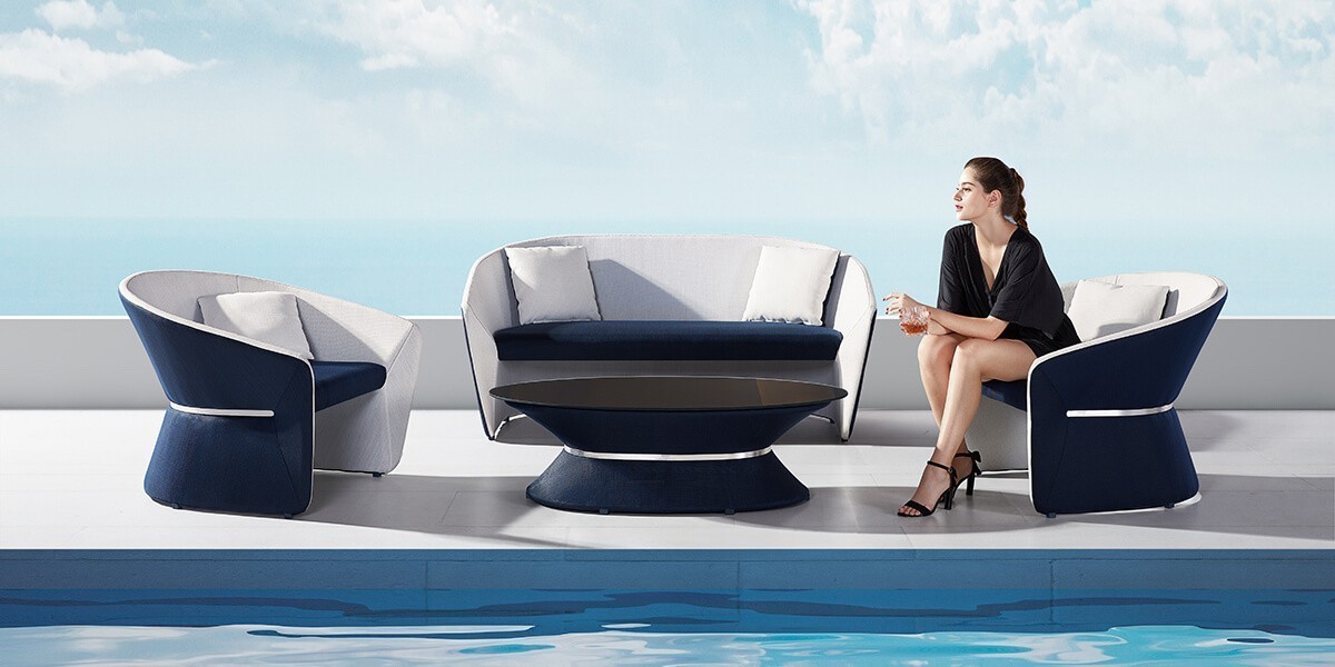 Una collezione che si caratterizza per la sua linea esclusiva di design, trasmettendo leggerezza e allo stesso tempo robustezza e solidità. Un coraggioso gioco di linee curve e rette reso possibile abbinando la struttura in alluminio ai tessuti sintetici delle sedute, appositamente studiati per l’outdoor, e al piano in HPL dei tavoli da caffè e da pranzo.