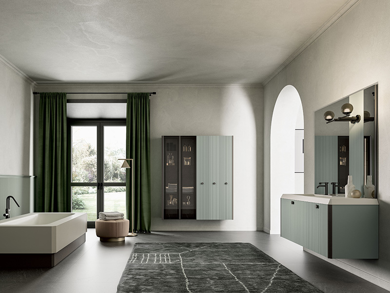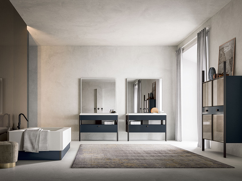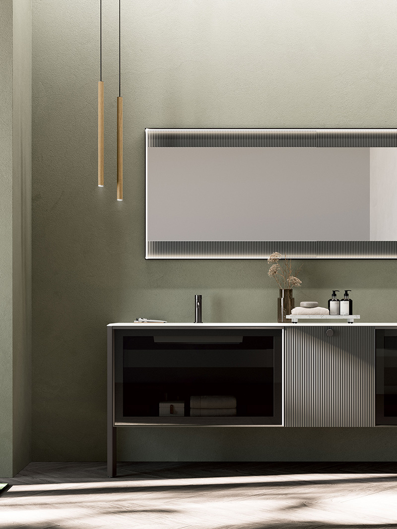 Le basi lavabo sono disponibili sospese o a terra, con ante piene o a telaio; l’impugnatura può essere arricchita da pomoli la cui godronatura richiama la leva del miscelatore coordinato o, ad esempio, la finitura degli accessori, tra cui l’appendino da parete Comma, minimal ed elegante.