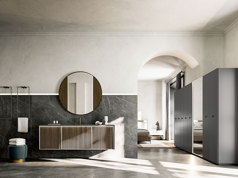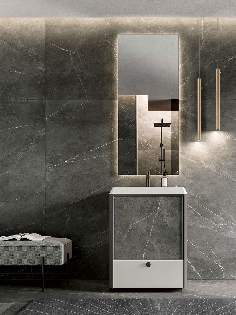 Tutti gli arredi hanno una componente metallica laterale, con sfaccettatura a taglio diamantato, ripresa dai lavabi, come nel caso del modello ad appoggio Lingotto, e nella vasca Relax. Per chi preferisce la soluzione a lavabo integrato, segnaliamo la possibilità di creare un richiamo materico tra interno lavabo e finitura dell’anta, a riconferma della capacità di Cerasa di non lasciare nulla al caso, permettendo di creare composizioni che anche in sala da bagno possano raccontare qualcosa di noi.