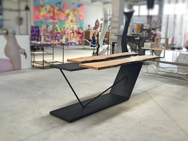 Le tavole in massello di rovere, naturalmente decorate dai molluschi marini che le hanno abitate, vengono “poggiate” sulla struttura in ferro che è top e sostegno dell’intero prodotto.