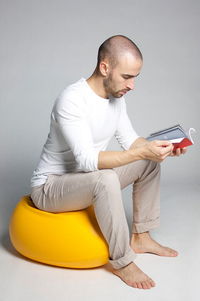 La presenza inoltre di un contrappeso posto alla base della struttura, permette al pouf di tornare sempre in posizione verticale; anche quando viene utilizzata in posizione orizzontale, una volta in piedi, torna alla sua posizione iniziale creando un suggestivo movimento ondulatorio.