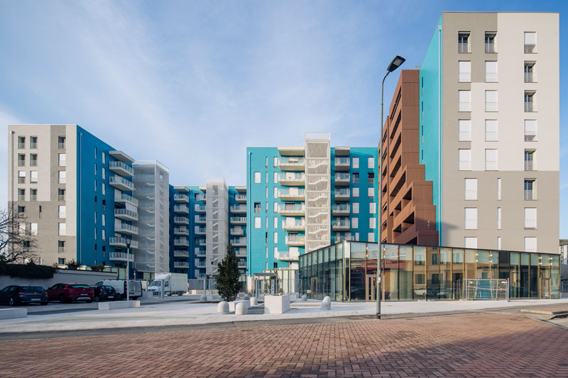 Il progetto si inserisce con un tema ben preciso, all’interno di un’area interessata negli ultimi anni da una profonda trasformazione: costruire luoghi dove abitare, in una zona storicamente occupata da attività produttive. Due edifici semplici di nove piani fuori terra con impianto ad “elle”, che nascono dall’importanza data al nuovo parco pubblico circostante e alla permeabilità dei flussi. I volumi sono caratterizzati dal disegno delle logge e dei terrazzi; le facciate sul contesto urbano sono intonacate, mentre quelle che si affacciano sulla piazza centrale sono rivestite con piastrelle in gres porcellanato blu iridescente della collezione Diamante Boa posate con tecnica ‘a giunto zero’. L’effetto è vibrante, vivo, in dialogo con la luce.