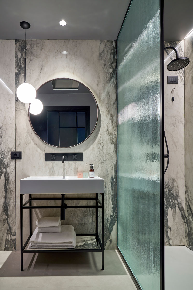 Il carattere deciso e unico del nuovo hotel passa anche dalla scelta mirata di inserire – sia come rivestimento che come pavimentazione – le lastre in gres porcellanato Florim, selezionate per i diversi ambienti in base alla caratterizzazione voluta per ciascuno di questi spazi.