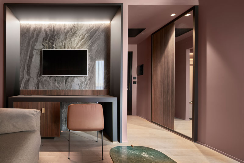 Studios è stata scelta anche per i bagni delle camere e delle suites, in abbinamento alle eleganti lastre di Étoile de Rex. Per le zone principali delle camere invece, ritornano le lastre ispirate alle essenza lapidee rare di Prexious of Rex insieme alla collezione I Filati: una serie ideata in collaborazione con Rubelli, che si ispira all’arte del tessuto e ben dialoga con il design anni ’50 voluto dai progettisti.