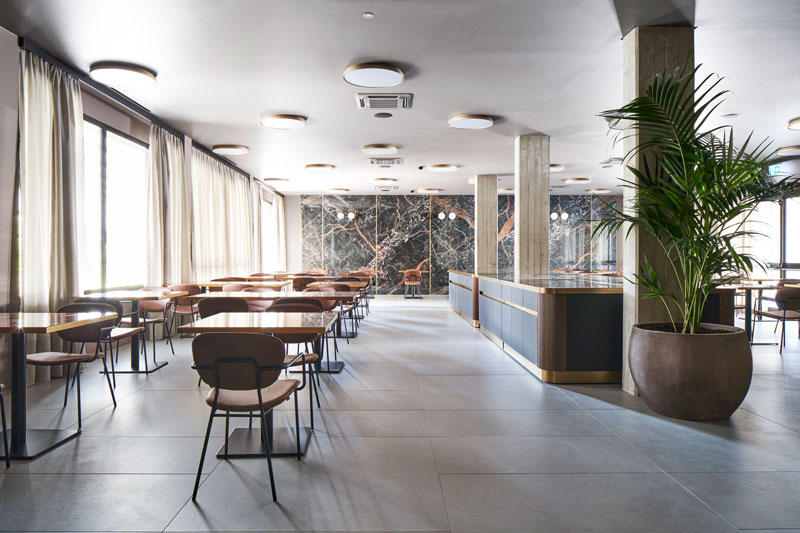 Negli stessi spazi, per la pavimentazione è stata invece scelta la collezione Studios, lastre di ispirazione cementizia che uniscono le prestazioni del gres ad un design discreto, per un’atmosfera calda e accogliente.