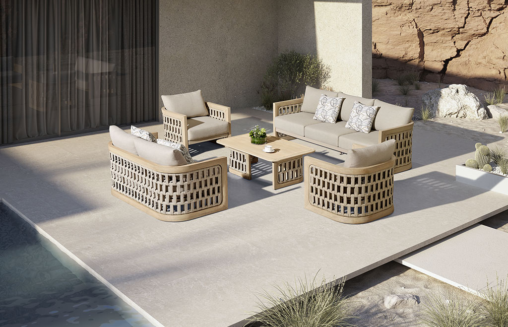 Riva si distingue, invece, per il suo design essenziale e contemporaneo. Con una palette cromatica raffinata e l’utilizzo predominante di uno tra i materiali più pregiati e resistenti per l’uso esterno come il teak, questa collezione trasforma gli spazi esterni in autentici rifugi di stile e comfort, ideali per godersi la dolce vita all’aria aperta.