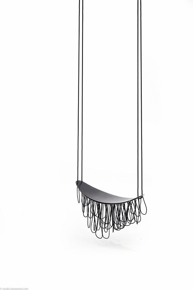 Una scultura-altalena, al confine tra arte contemporanea e design, che con i suoi 42 metri di corda utilizzati, rappresenta il culmine massimo del processo artistico di Ingrid, ai confini con l’artigianale; di design ha solo il lato pratico, ovvero la sua funzione. Una scultura in movimento e leggera, con un tocco di “Rock and Folk”, che grazie al suo sistema di aggancio tedesco brevettato e silenzioso, può essere facilmente installata all’aperto, il sedile è in acciaio termolaccato, ma anche all’interno: un suo cliente l’ha infatti integrata nel proprio soggiorno come sedile mobile.Ogni pezzo è unico e la sua forte personalità ridefinisce uno spazio e cattura l’attenzione.