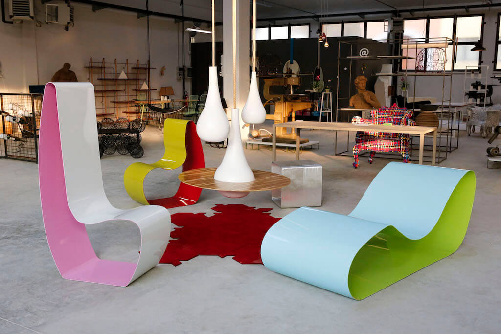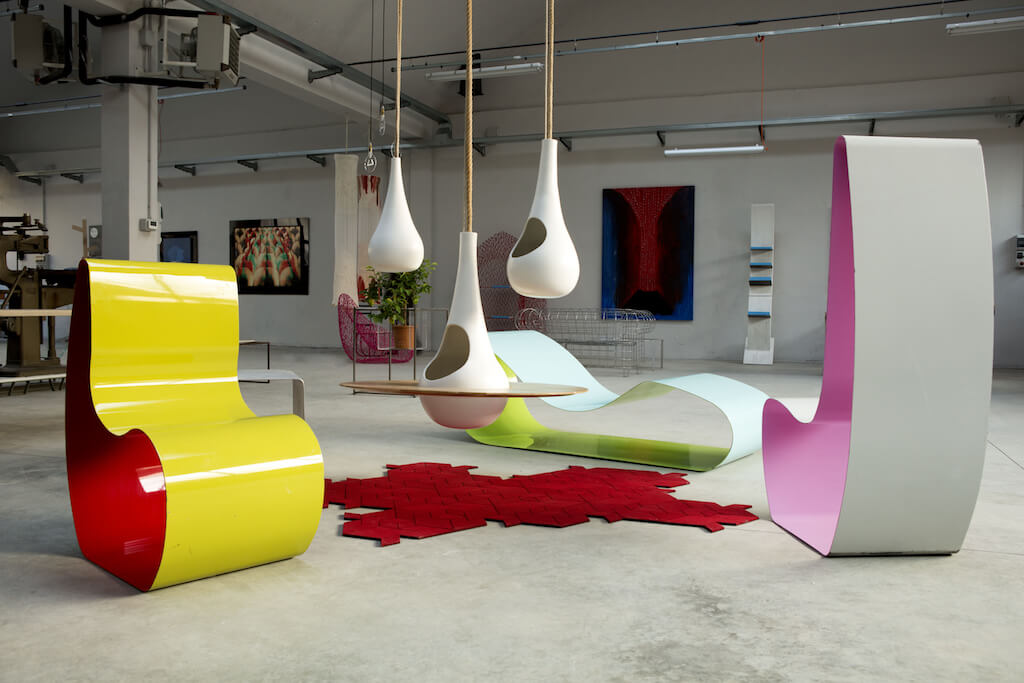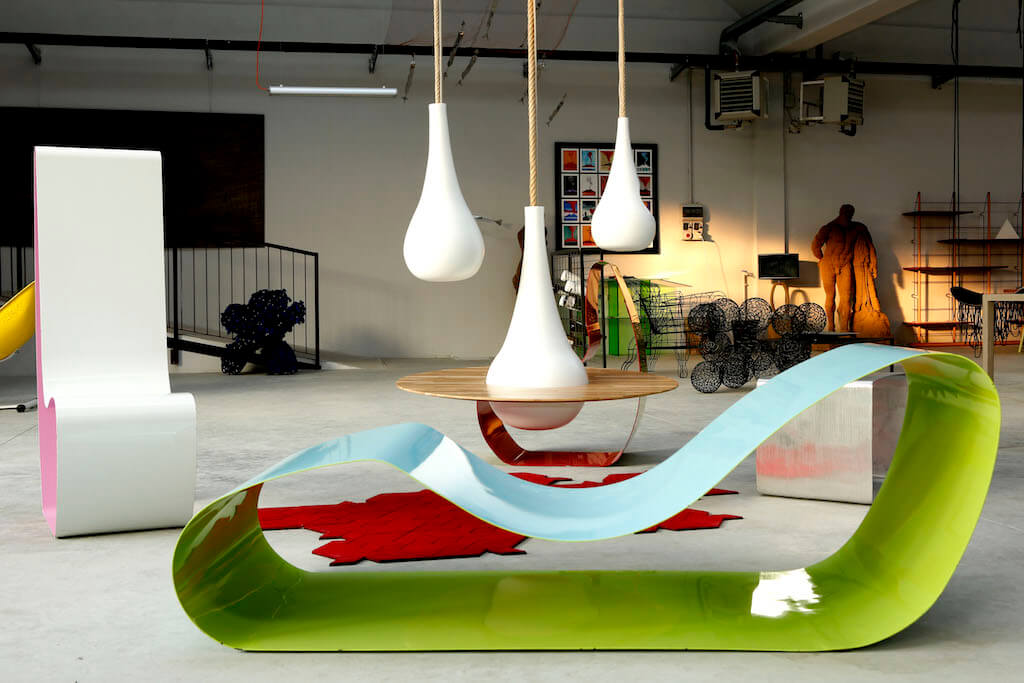 Tra le sue creazioni, degna di nota è sicuramente la collezione “Omaggio al maestro”, una collezione di sedute in acciaio armonico verniciato con liquido realizzata omaggiando i primi lavori di Ron Arad, architetto e designer di origine israeliana che da lavora sul confine labile tra il design industriale e l’arte contemporanea.