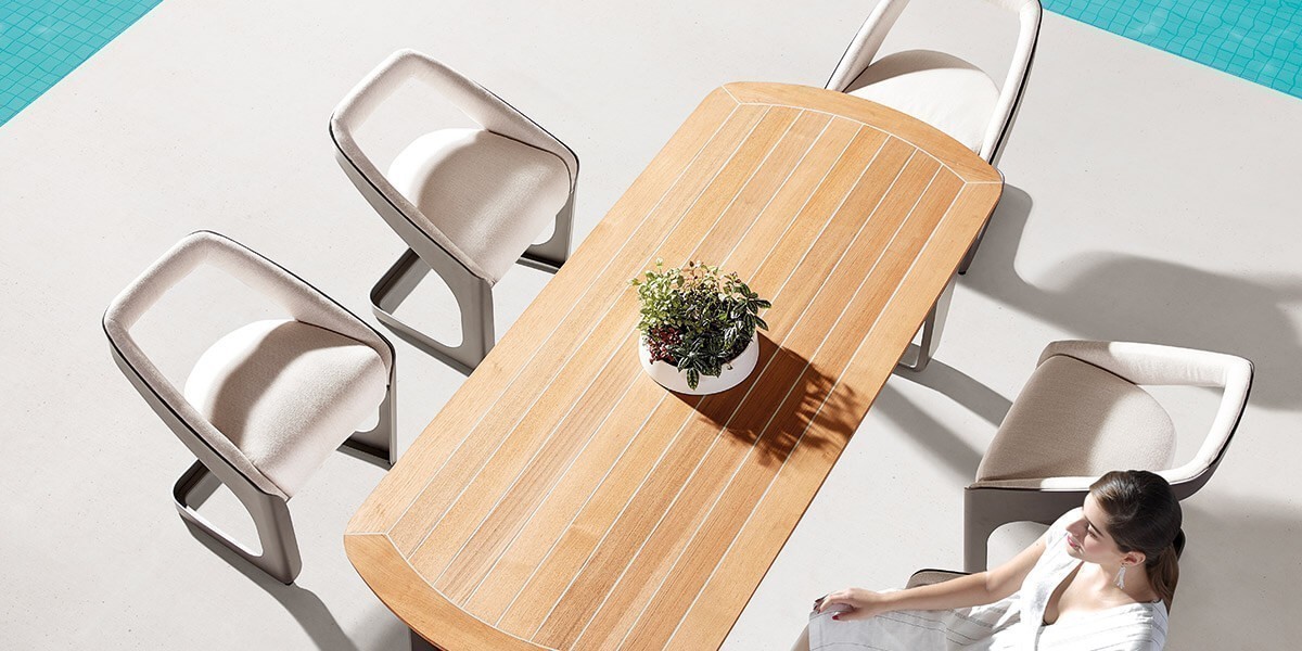 Linee diverse tra loro ma dal carattere unico dato dall’uso di materiali di alta qualità: il cuore della zona lounge è dato infatti dalla struttura in alluminio, disponibile in tre colorazioni diverse, che va a sostenere e a fondersi con la cuscineria, con la possibilità di scegliere fra diversi tessuti e colori: il Sunbrella o il tessuto nautico, tipico degli yacht di più alto prestigio. Per la zona pranzo invece, l’alluminio incontra il Teak birmano che, insieme alle ampie sedute magistralmente abbinate, donano all’intero set un senso di protezione e relax.