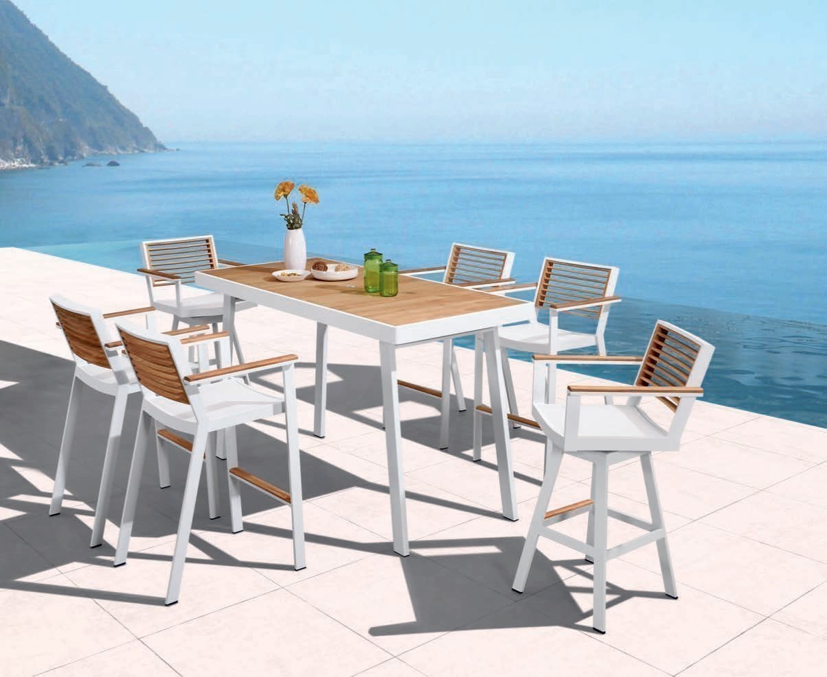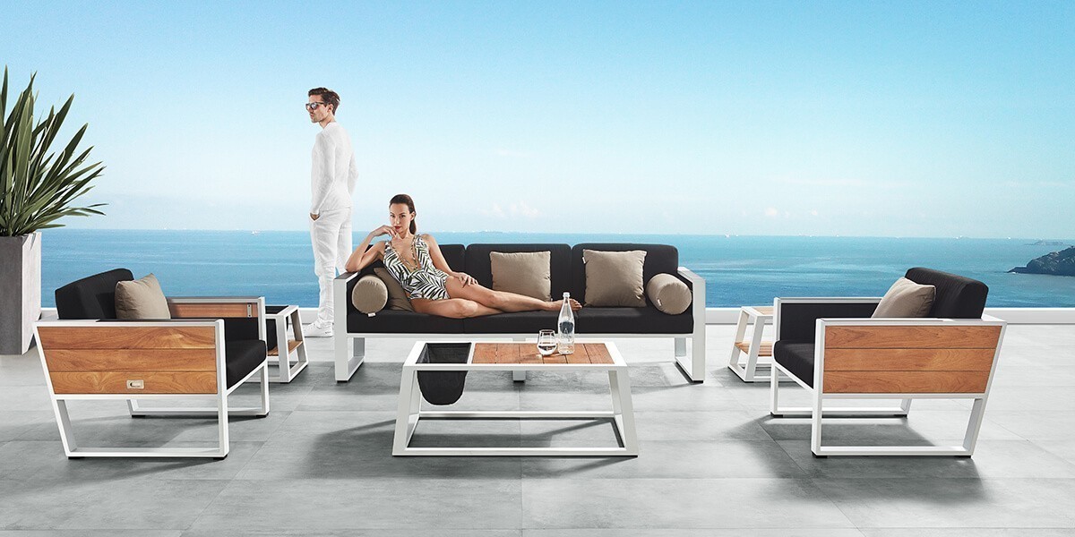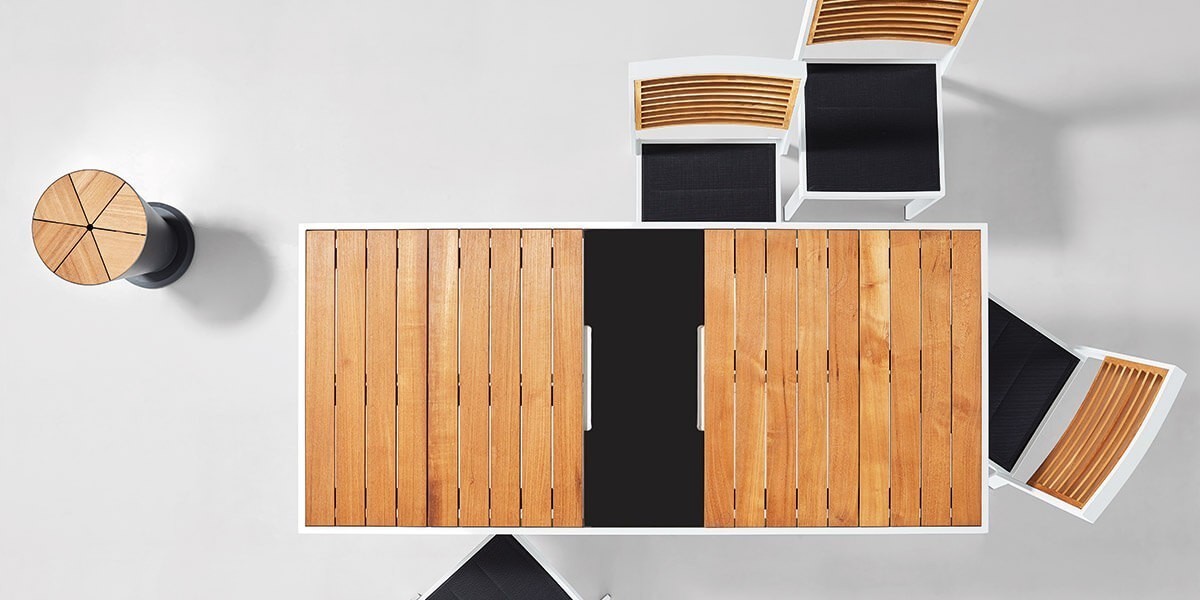 Osservandola, la percezione che trasmette è quella di compattezza e robustezza, grazie alla struttura in alluminio ben piantata a terra e alla presenza massiccia del teak, che troviamo sia sul piano dei tavoli sia sui pannelli laterali delle sedute, dando vita ad un design molto vicino anche ad uno stile indoor, rendendo questa collezione versatile nel suo ambiente.