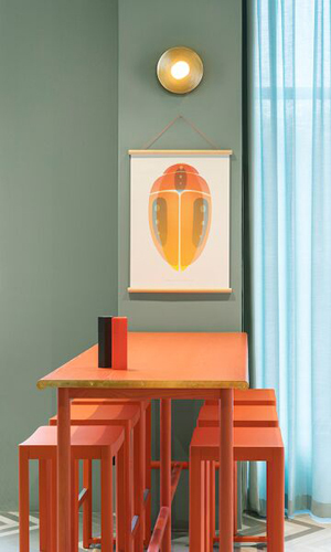 Verde intenso, verde chiaro, pesca e rosso sono stati infatti destinati sia ai rivestimenti che agli arredi.