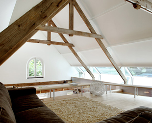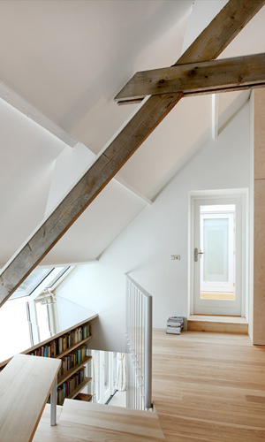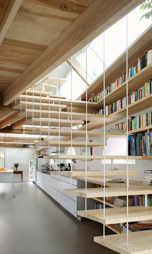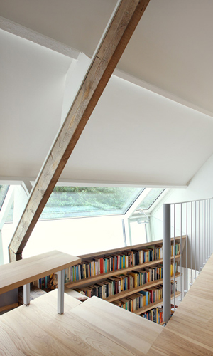 Gli architetti hanno così aperto il tetto con alcuni lucernari che permettono l’ingresso della luce e sopperiscono alla dimensione ridotta delle finestre. A questo è stato aggiunto un arredamento multi funzione in cui lo stesso mobile fa da cucina, scala e libreria.