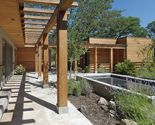 La struttura è a U con portico e piscina posti davanti . Tutta la casa è in legno, formata da cinque volumi con ampie finestre e porte scorrevoli tutte rivolte a sfruttare la natura connettendo la casa al parco che la circonda completamente. L’arredamento sfrutta il legno, come tutte le case sul genere, ma abbina dettagli in acciaio, pareti bianche e bagno moderno così che non si perda il dualismo su cui poggia tutto il progetto e che permette anche alla campagna americana di fare l’occhiolino alla città.