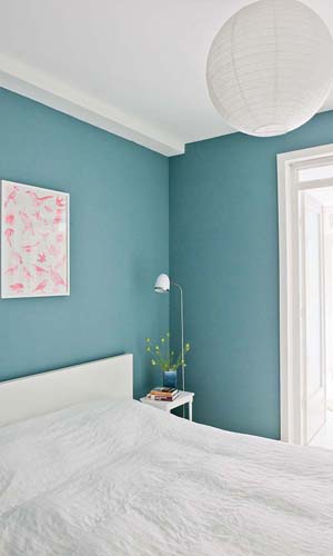 Unica nota di colore è la tonalità di blu turchese applicata alle pareti della camera da letto e che si distacca così, completamente, dalla zona living. Pochi dettagli, ma ben studiati creano il perfetto contrasto, nuovi punti focali e scorci suggestivi. Si susseguono, infatti, lampadari lavorati, comodini originali e tavolini lineari.