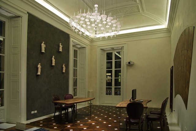 Concentrandoci sulla sala di consultazione/conferenze (sala-pilota per le successive) si osserva che il concetto illuminotecnico di base è stato quello di creare un’illuminazione generale diffusa in tutto l’ambiente. Per ottenere ciò, innanzitutto, si è cercato di dare un’illuminazione indiretta, derivata dalla volta (che si è trasformata nella superficie emittente principale). La riflessione delle linee LED nascoste dietro la decorazione perimetrale in gesso fornisce un livello di illuminamento accettabile in tutto l’ambiente, senza lasciare aree scoperte. Il centro della stanza è poi evidenziato da un’ellisse luminosa (formata da downlight a LED) che proietta la luce su corpi in vetro di Murano sospesi dal soffitto, formando così un alone luminoso diffondente.