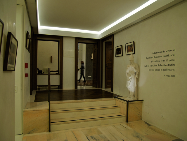 L’Archivio della Veneranda Fabbrica del Duomo di Milano si presenta come una serie di ambienti disposti al primo piano su tutto il prospetto principale del palazzo sede dell’ente, di fronte all’abside del Duomo di Milano. La realizzazione del progetto, a cura dell’ingegnere e lighting designer Dario Maccheroni, prevede due lotti: il primo è composto dalle aree di ingresso, il deposito, una sala polivalente e una nuova sala di consultazione/conferenze; il secondo lotto invece comprende tutte le altre sale di consultazione e archiviazione, che si sviluppano in sequenza lineare diretta rispetto alla prima e terminano con la sala storica di consultazione.