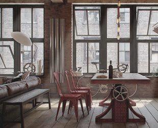 Tutti gli arredi si adattano a un carattere industriale con tubi d’acciaio, materiali ruvidi e effetti in grassetto che allontanano ogni vena femminile da una casa dove al centro c’è sicuramente solo il cliente.