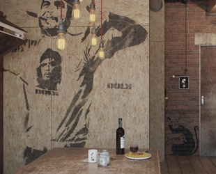 Niente angoli dedicati alla famiglia o a futuri figli, ma una vera tana dove rifugiarsi con gli amici fra pareti effetto nudo, travi a vista, mattoni e seggiole in metallo.