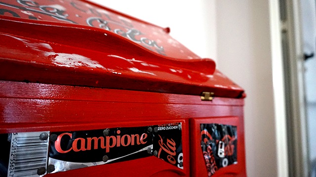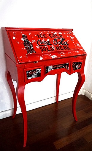 Un esempio tra i pezzi dell’ampia collezione della designer è la ribalta Coke, presentata nel nuovo spazio TID, in cui il famoso marchio di bibite viene esaltato da pezzi riciclati applicati sulle facce di un antico mobile.
