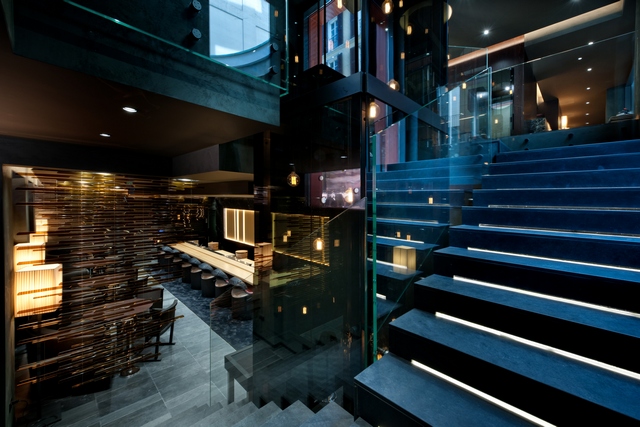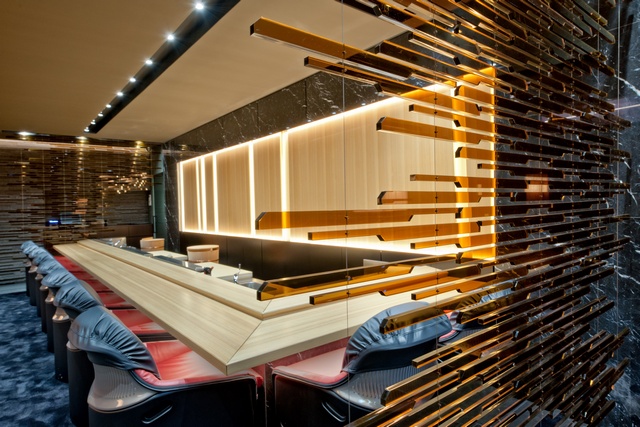 Il ristorante è diviso in tre zone: il dehors all’esterno funge da palcoscenico naturale, entrando, al piano rialzato, la zona per la cottura teppanyaki, mentre scendendo una scalinata si arriva al piano interrato, dove domina il banco sushi. La gamma cromatica è declinata su toni neutri ma intensi, come il grigio, il nero e varie tonalità di beige e marroni.