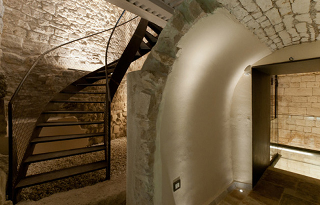 A operare il cambiamento gli architetti di Esseelle Associati che in punta di piedi hanno reinventato gli spazi di questo antico palazzo mettendo in risalto la storia e aggiungendo i dettagli di oggi. Un’operazione difficile, conclusa nel 2012 dopo un anno di lavori, che han richiesto numerosi cambiamenti in corso a causa del succedersi delle scoperte durante gli scavi. Gli architetti hanno così adattato l’interior design e l’arredo alla storia senza limitarsi, ma sfruttando ciò che già esisteva e usandolo a proprio vantaggio. Antiche cisterne, granai e mura originali contribuiscono a definire questo luogo magico in cui le vetrate, il bianco ottico e l’acciaio abbracciano le nicchie, gli archi e i solai in legno originali che in alcune parti è stato possibile recuperare.