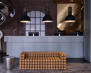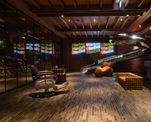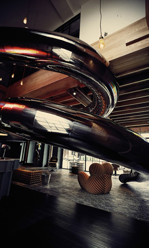 E’ decisamente audace la scelta dei complementi degli arredi e delle strutture insolite realizzate soprattutto nell’ingresso che invitano a provare una stravagante ed unica esperienza. Un esempio è il tunnel che collega il secondo piano al primo. Ne avete mai visto uno simile al di fuori del parco giochi? Il tubo è in acciaio, ha una forma a spirale ed ha una lunghezza totale di 27 metri. Evoca certamente il senso di ilarità e ironia voluto per l’hotel e cattura l’attenzione e la fantasia. Un originale divano creato dall’assemblaggio di piccoli palloni da calcio e un vecchio orologio che accende una nota nostalgica del tempo passato, completano l’arredamento della hall.
