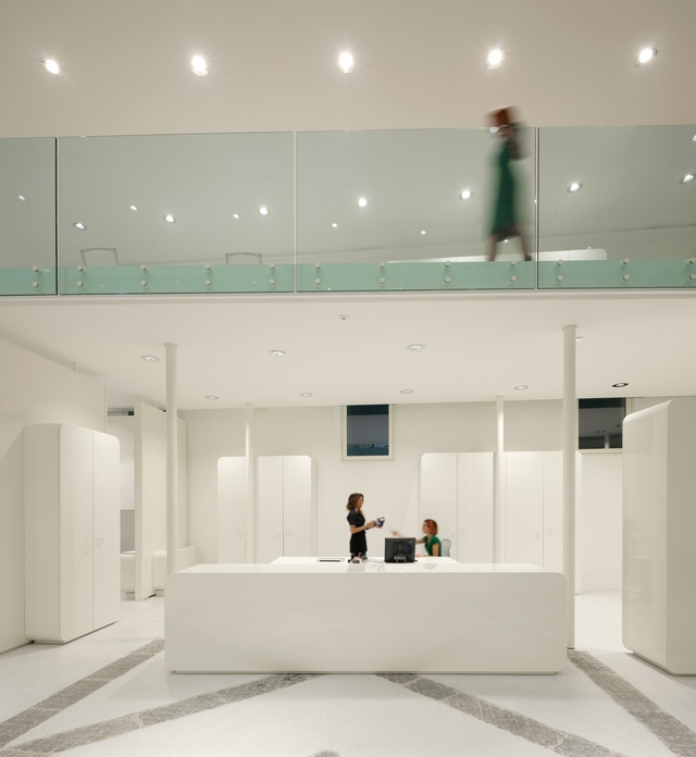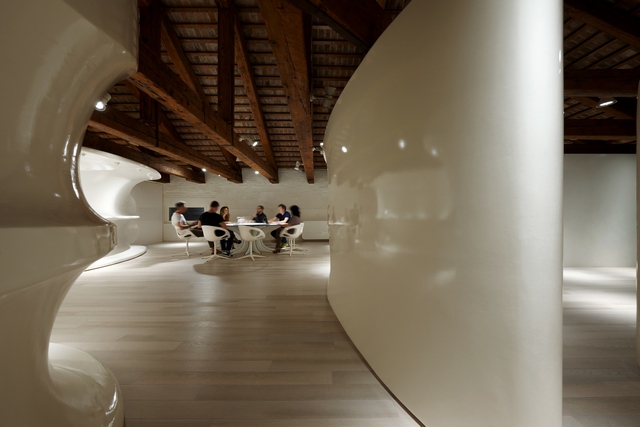Candore e trasparenza permettono di leggere le antiche presenze: i collegamenti verticali, i parapetti in cristallo e lʼascensore completamente vetrato sono gli elementi di una nuova architettura digitale che, giungendo a compimento attraverso i limpidi ed efficaci effetti cui i giochi di luce danno vita, si pone in antitesi alla matericità dei dettagli antichi, sempre ammirabili. Il piano terra ospita in sequenze openspace gli uffici della divisione creativa. Lo spazio è dominato da un armonico chiarore e dallʼapollineo rigore di forme pure. Nella parte centrale, sfondo allʼampia reception, alcuni setti bianchi ad angolo curvo individuano gli uffici grafici. Le porte sono scorrevoli ed a scomparsa così da favorire il movimento libero della luce, come del pensiero. Bagliore artificiale e luminosità naturale si fondono insieme, al fine di dare vita ad un’aurea magica che totalmente abbraccia l’uomo, favorendo il suo benessere e non affaticando la sua vista. Dalla scala e dallʼascensore in acciaio verniciato bianco e vetro si accede ai leggerissimi soppalchi su pilotis del primo piano dove in quattro settori principali tutti open space sono individuati.