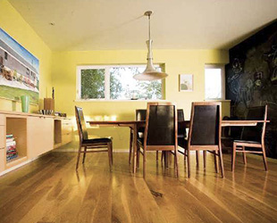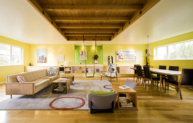 Il salotto, con il soffitto caratterizzato da una passerella in legno, si divide fra la zona pranzo e il divano separati da un’altalena che oscilla all’interno delle pareti verde mela e limone. Mentre per il divano sono stati scelti i colori naturali, che si abbinano ai mobili in legno, il tappeto contrasta con il tono argentato e i disegni geometrici.