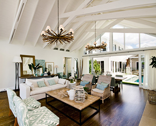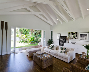 Il soffitto con le travi e le pareti sono completamente dipinti di bianco per aumentare l’effetto luminoso della casa, mentre i pavimenti svettano per il loro colore scuro in contrasto anche con la scelta di interior design nelle tonalità chiare con accenni polvere che si amalgamo perfettamente a tutto l’ambiente.