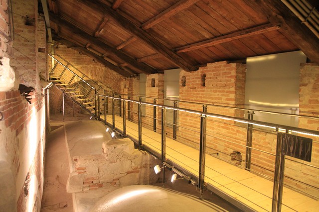 L’illuminazione a LED a basso consumo di energia impreziosisce gli elementi architettonici, che si possono ammirare su una comoda passerella metallica di oltre ottanta metri.
