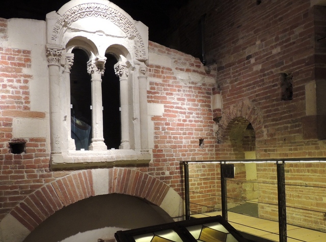 Il lighting designer Marco Palandella, che con questo progetto è stato tra i finalisti del Premio Codega 2014, ha lavorato allo scopo di restituire ai fruitori i particolari architettonici medievali dell’antica basilica attraverso i suoi sottotetti; il tutto con l’intento di non musealizzare le opere, ma di far conoscere la storia dell’ edificio attraverso un itinerario particolare e istruttivo. La visita parte dalla scala costruita nel deambulatorio dall’architetto Edoardo Arborio Mella (1808 – 1884), che consente di ammirare la struttura muraria dell’abside medievale con una bella monofora liberata dal pesante intonaco ottocentesco.