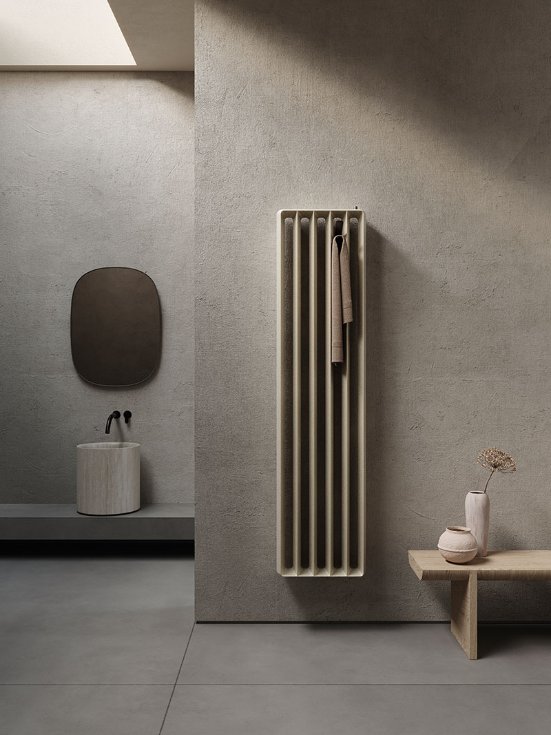 Il radiatore è caratterizzato da un aspetto materico dettato da una trama geometrica e da una superficie tridimensionale ed enfatizzato dalle finiture goffrate studiate ad hoc per questo prodotto. Installabile sia in orizzontale sia in verticale e componibile fino a un massimo di cinque elementi, assicura un’elevata resa termica e risparmio energetico.