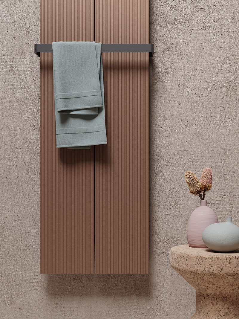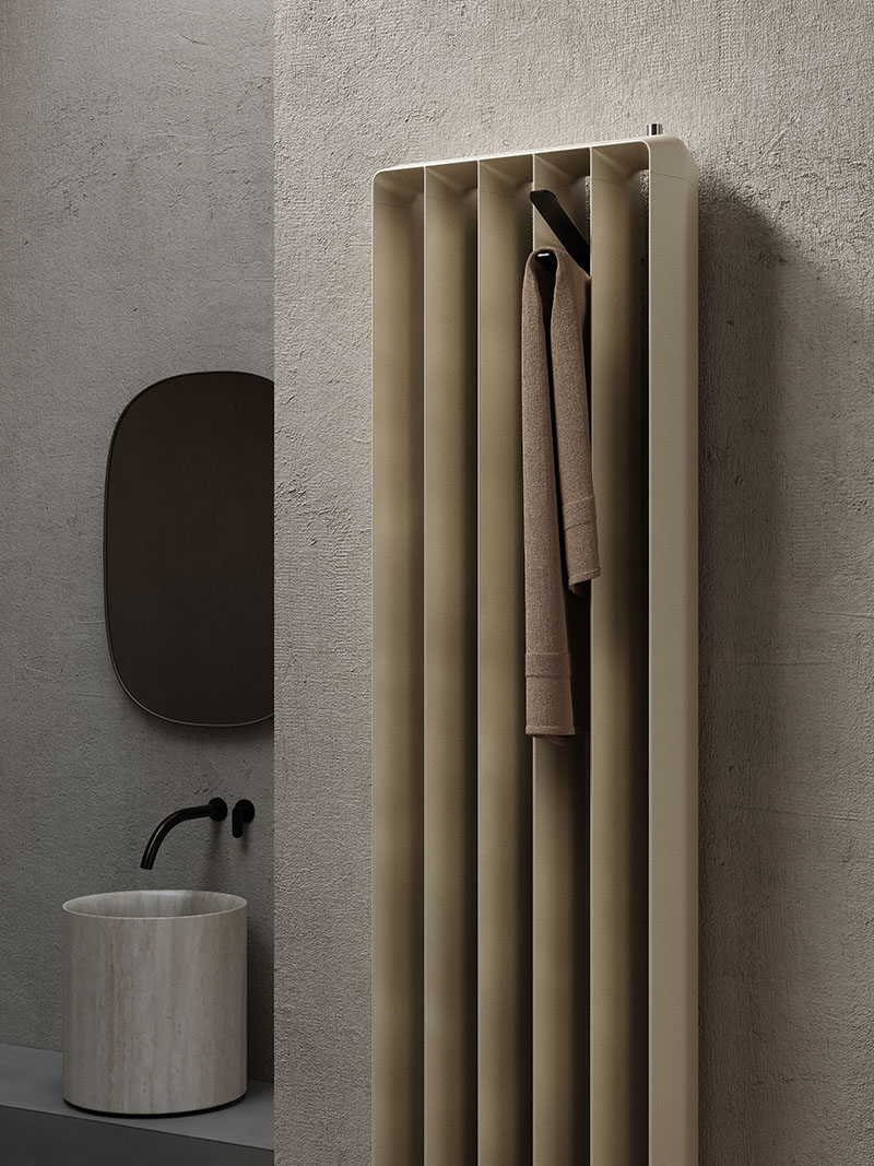 Il corpo scaldante, in alluminio 100% riciclabile e disponibile sia con funzionamento idraulico sia elettrico, è caratterizzato da una texture dall’effetto increspato, con piccole onde.